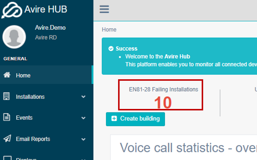 1. On home page of the HUB, click on “EN81-28 Failing Installations” located at the top of the home page. A number on red will be shown underneath. This represents the number of installations that have failed the 72hr/3day Background Check Call.